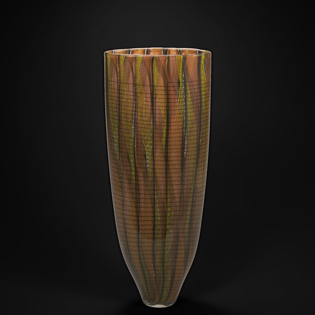 作品名のアウトゥンノとはイタリア語で秋を意味し、晩秋を思わせる落ち着いた色彩がとても美しい作品です。高さ50㎝程の大型の作品のため、太さのあるレース・グラス棒を用いて制作されています。このような太いガラス棒を何本も熔着して器に仕上げるには、卓越した技術を必要としますが、この一糸乱れぬ模様がリノ・タリアピエトラの技術力の高さを物語っています。