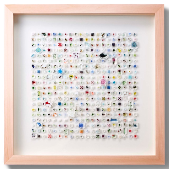 およそ400個のムッリーネと呼ばれるモザイク・グラス片を収めた、ガラス作家・江波富士子による作品です。まず、一片のモザイク・グラス片を制作するためには、色ガラスを組み合わせて、断面が鳥や草花の模様になるように、ガラスの塊を作ることから始まります。次にガラスの塊を、5ミリ角から7ミリ角程になるまで引き延ばして、ガラス棒にします。ガラス棒が冷めないうちに480度の窯に入れ、ゆっくり冷まして歪みを取ります。その後、裁断機でガラス棒をカットしていくと、まるで金太郎飴のような模様の入ったモザイク・グラス片が沢山出来上がるのです。
