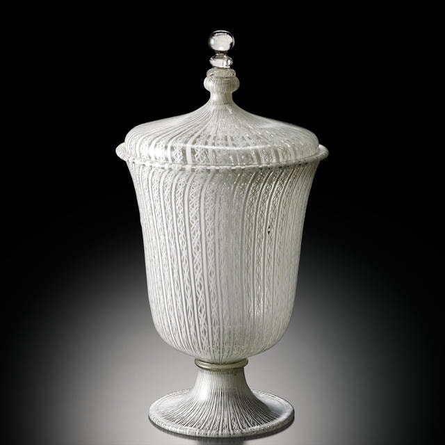 この形は、熱を帯びたガラスの柔軟性を利用し、遠心力と重力によって作られています。まずレース・グラス棒を並べて熔着し、それを鉄パイプで円筒形に巻いたものを十分に加熱、そして遠心力を用いてガラスを円盤状に広げます。その円盤を下に向けると自重で垂れ下がり、この作品のような形が自然に作られていきます。ガラスを吹いて形を整える伝統技法とは異なった画期的な着想は、ヴェネチアン・グラスの現代的な展開として大きく評価されました。