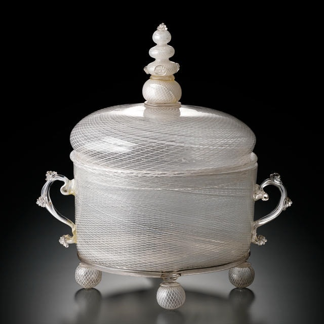 蓋付容器の全体に施されている格子模様をご覧ください。この格子模様は、イタリア語で「レティチェッロ」と呼ばれ、レース・グラスの中でも最も表現が難しいものです。表面の格子模様は、らせん模様の入ったガラスの筒を2つ重ね合わせることで制作されています。しかし、らせん模様を作る際に、一定の強さでガラスを回転させなければ模様の間隔が均等にならず、2つのガラスの筒を重ね合わせた際に美しい格子模様が生まれません。そのため、高度な職人技が要求される技法です。