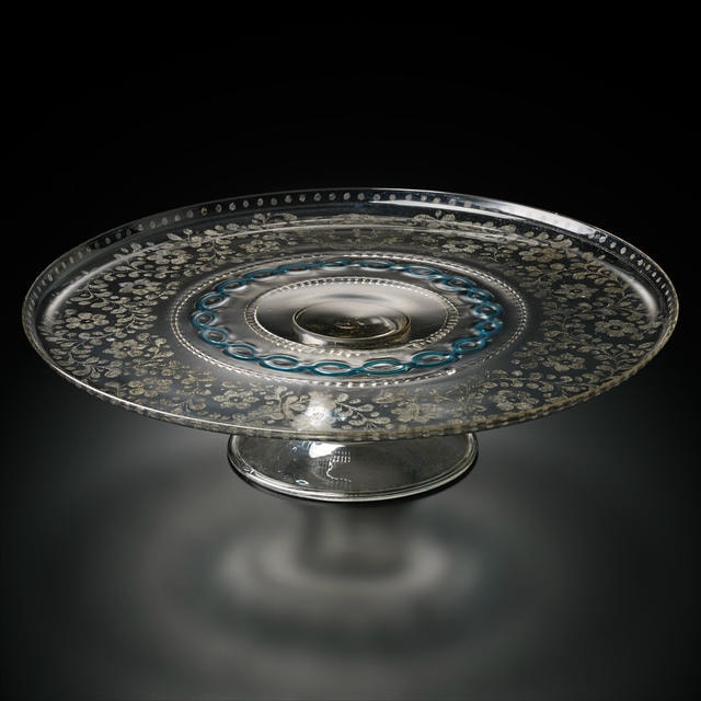 こちらは、可憐で繊細な草花模様が表現された、広がりのあるコンポートです。中心に施された、透明感のある青色ガラスが、丁寧に線刻された模様の美しさをより引き立て、ロマンチックで清楚な印象を与えています。コンポートの上部に注目すると、イタリア、ヴェローナのヴァンジェリスティ家の家紋も彫刻されています。