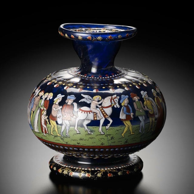 16世紀、ヴェネチアではヴェネチア派と呼ばれる画家たちにより、色彩豊かで情感あふれる肖像画や寓意画が描かれていました。彼らの目覚ましい活躍は、ガラスに模様を描くエナメル彩にも大きな影響を与え、ガラスをキャンバスに見立て、絵画的な絵付けが施されるようになったのです。例えば、婚礼用の長持や坏の多くに、愛の女神や勝利の女神に引き連れられた行進の様子が表されました。しかし、このようなガラス壺に描くことは稀で、貴重な作品の一つとなっています。
