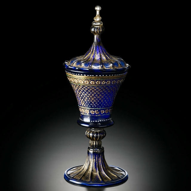 コバルト・ブルーの素地に、点彩と金彩による文様が施された、蓋付きのゴブレットです。ビザンツ帝国にみられる脚付き坏の形と、シリアなどイスラム文化圏で用いられたガラス顔料によるエナメル彩技法が取り入れられています。地中海貿易で隆盛を極めたヴェネチア共和国と、その周辺国との交流を象徴する作品の一つと言えます。
