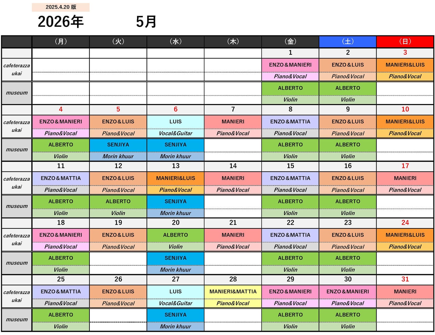 5月のカフェレストランおよび美術館内の演奏スケジュール。