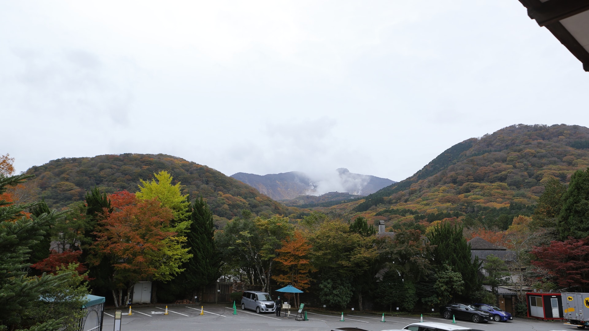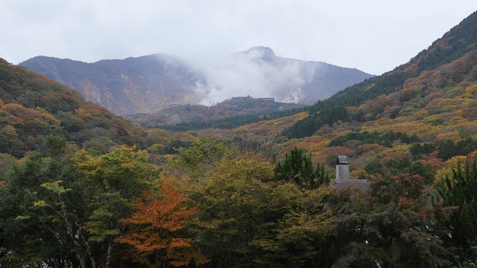 紅葉の山々とガラス庭園