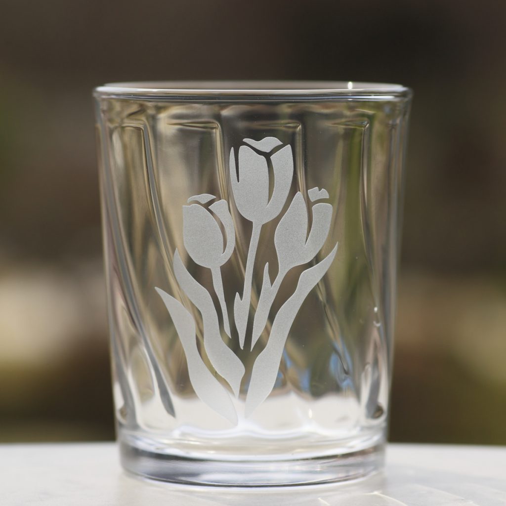 砂を吹き付けてガラスに模様を彫る、箱根ガラスの森美術館サンドブラスト体験工房では、季節限定モチーフとして「チューリップ」などをご用意いたしました。