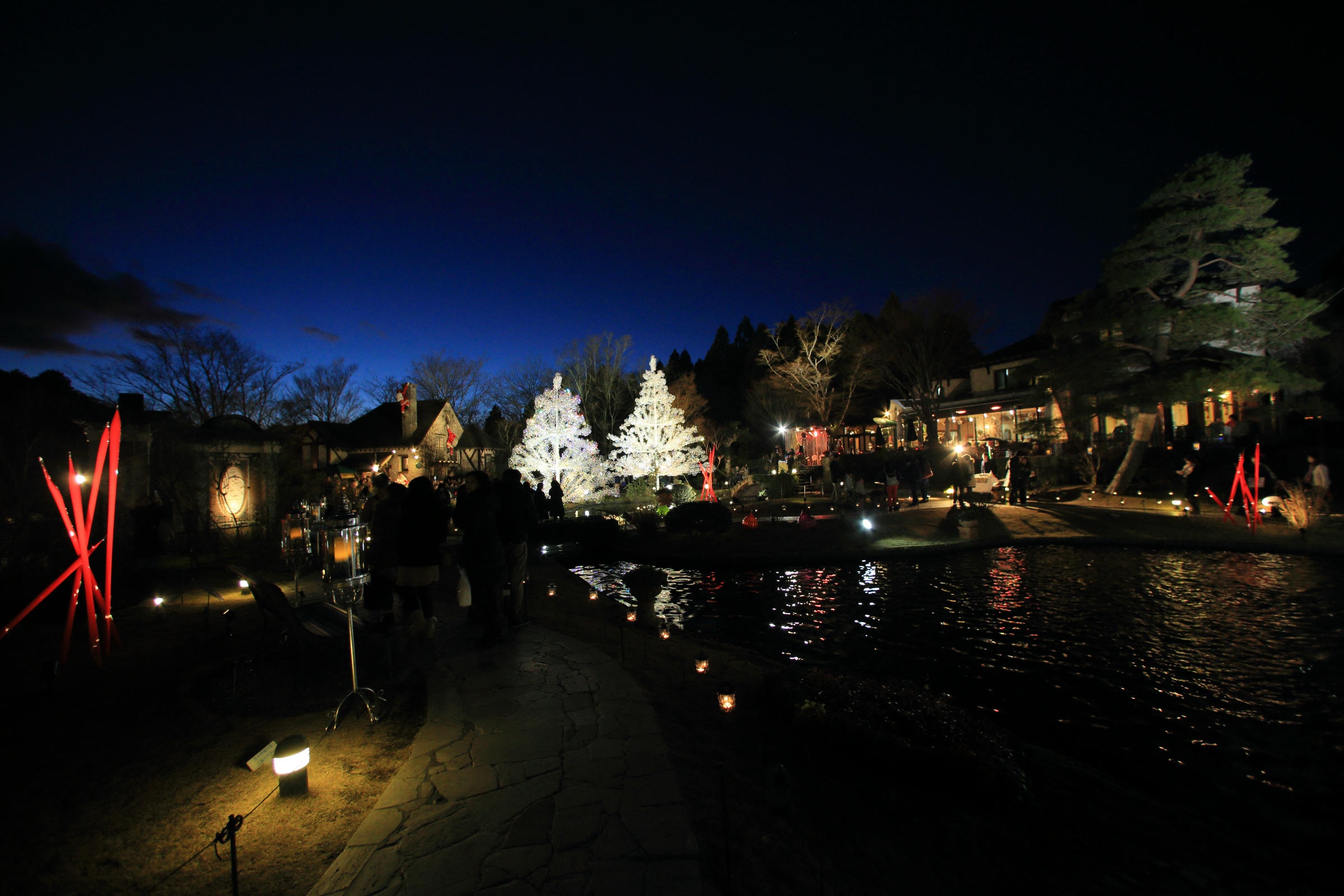 昼間に太陽光で色鮮やかに輝く姿から、ライトアップされた幻想的な姿へと移り行く様をご覧ください。