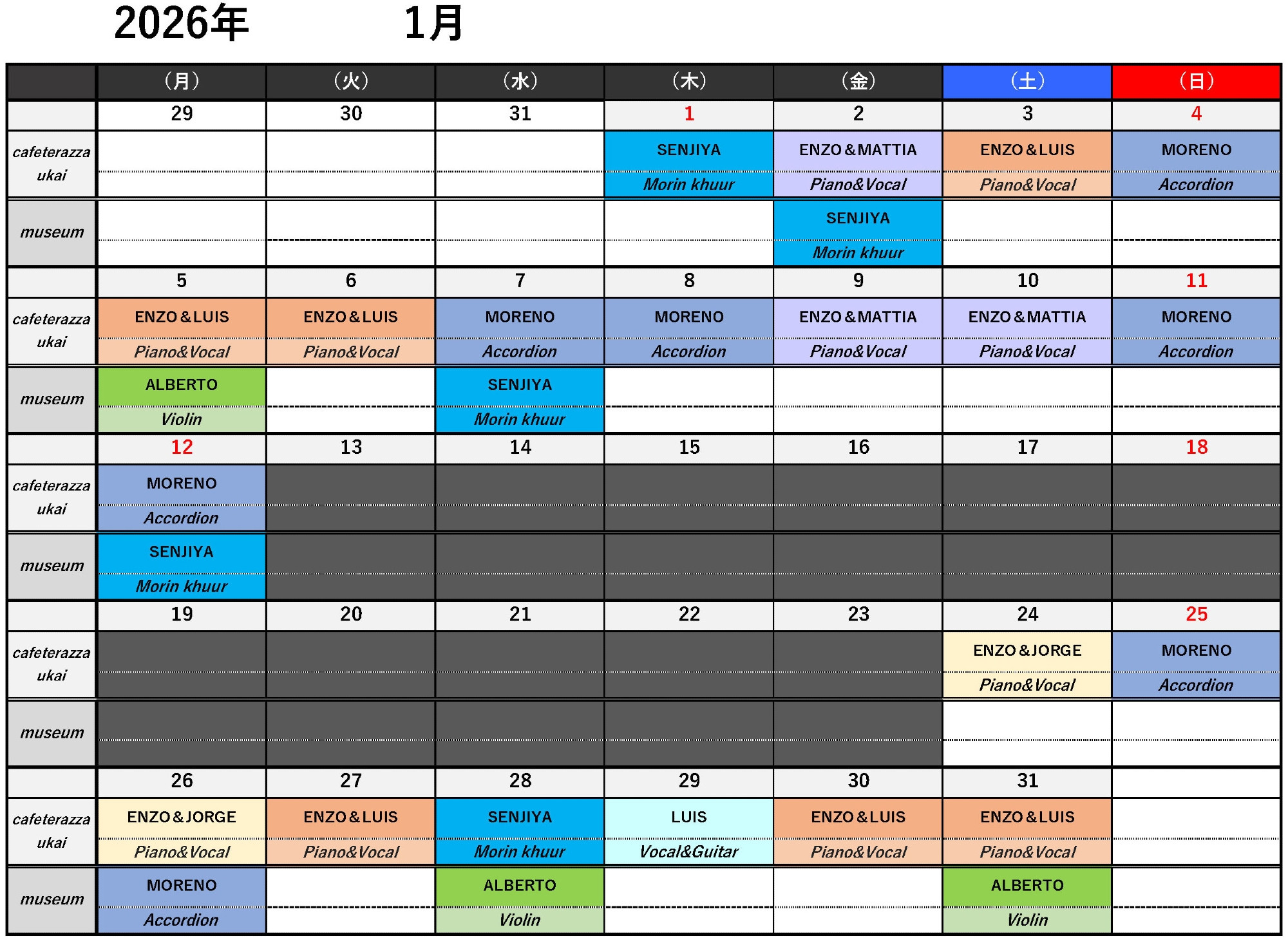 1月のカフェレストランおよび美術館内の演奏スケジュールです。