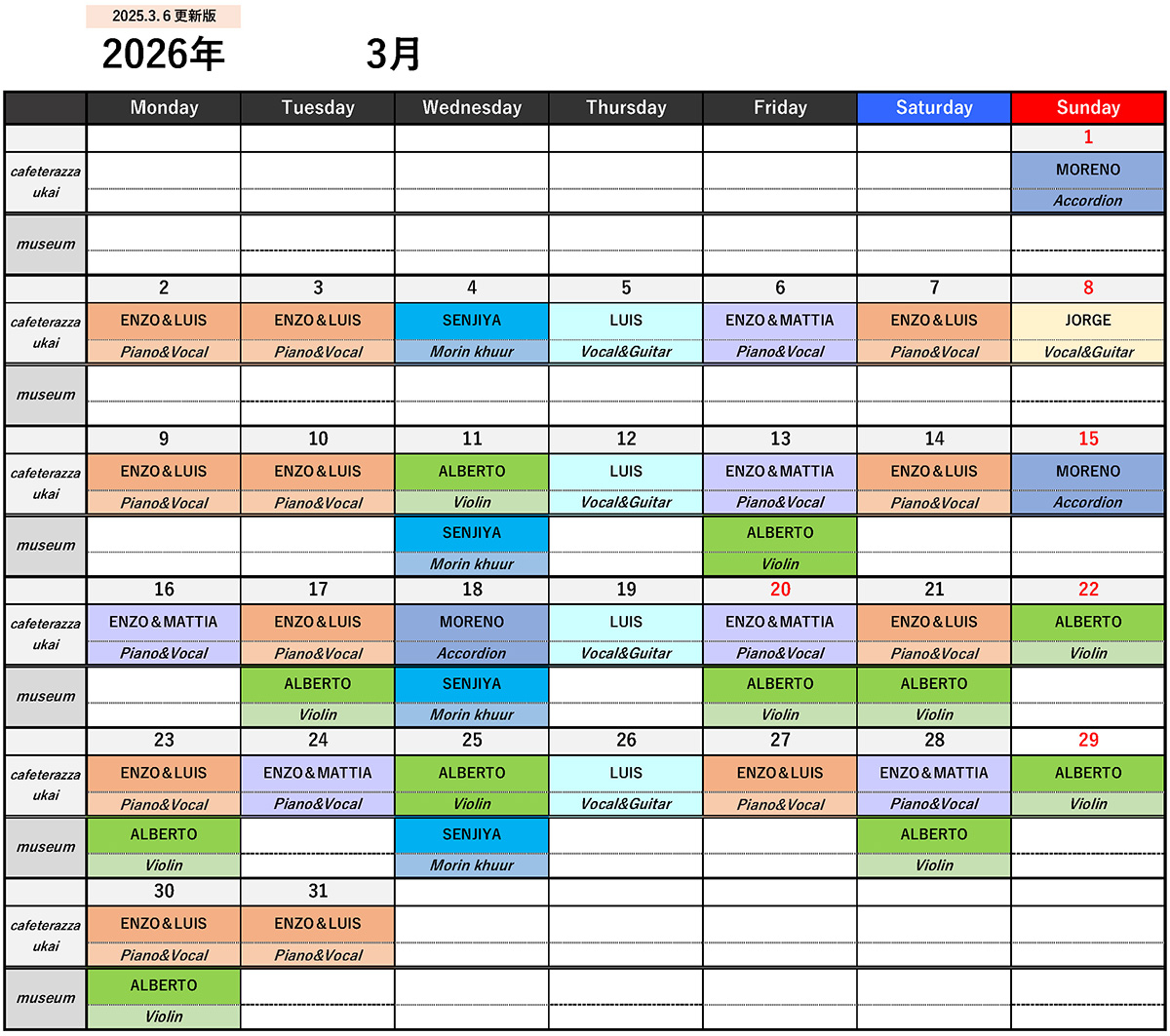 3月のカフェレストランおよび美術館内の演奏スケジュールです。