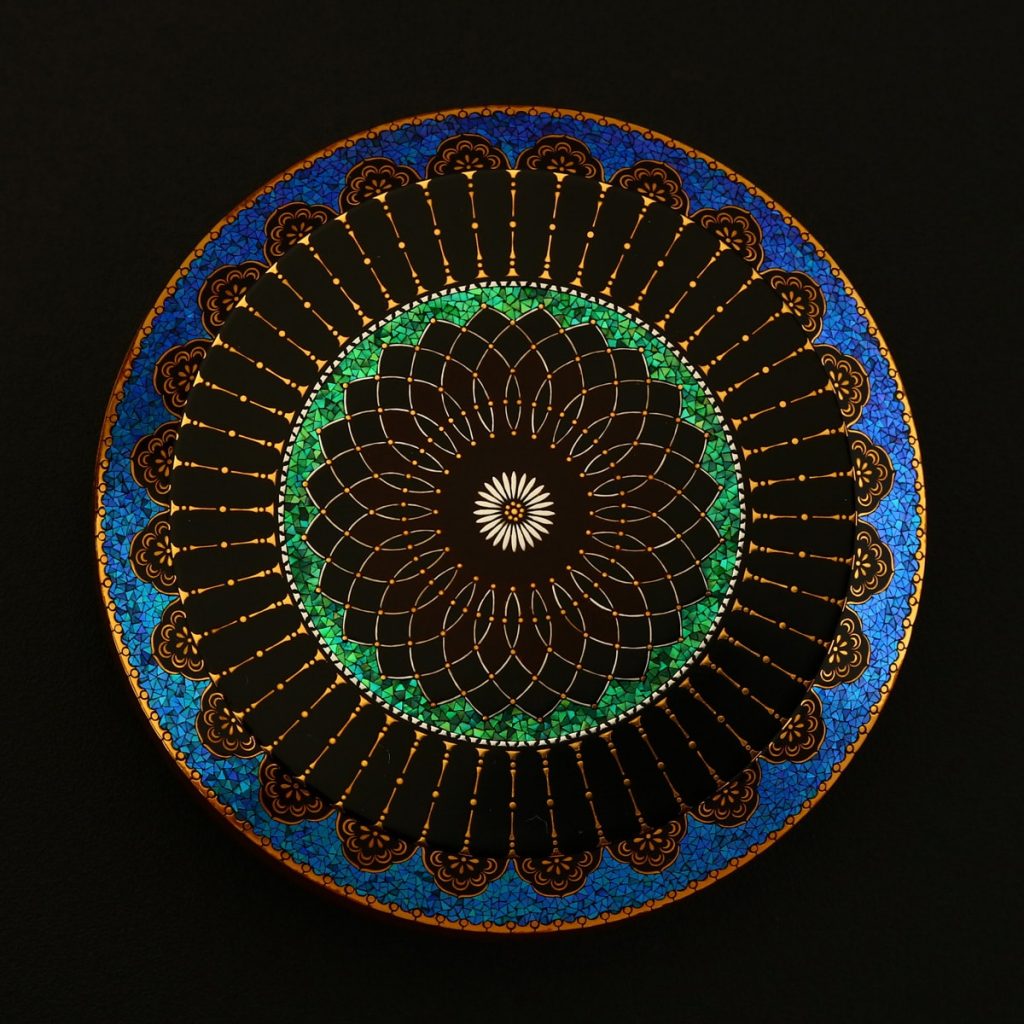 青から緑の色調の貝片を配した香合。小さいながらも、仏画に見られる曼荼羅やイスラームの幾何学文様を思わせる精密なデザインがあしらわれ、橋本千毅のデザインの独自性が感じられる。器の内部は梨子地仕上げとなっている。
