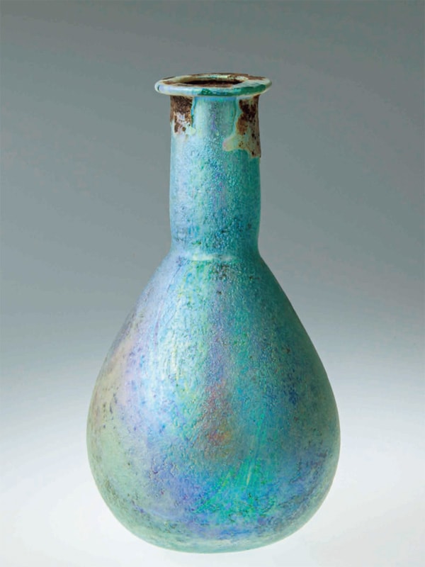 香油は高価な乳香や没薬ばかりではなく、様々な芳香植物を油に漬け込んで香をうつしたものが用いられるようになり、香の使用は拡大した。本作品の美しい銀色は銀化と呼ばれるガラス表面の化学変化で、製作時には見られないものが、2000年の時によって生まれたものである。