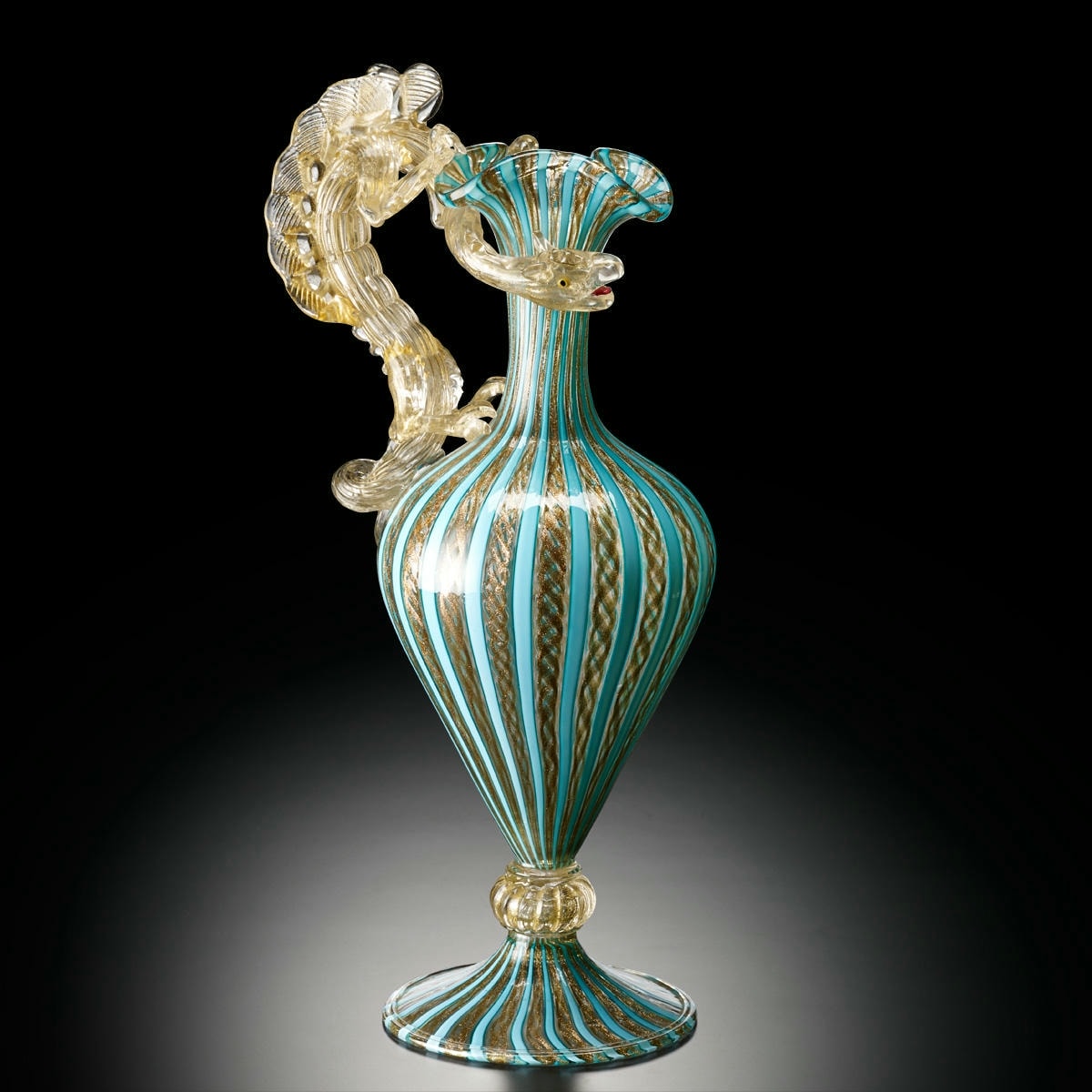 東洋の影響を感じさせる龍の装飾がついた水差。アヴェンチュリンのレース・グラス棒と水色ガラス棒を交互に配したレース・グラスで作られている。脚は金箔熔着したホローノップ、台は坏身と同じパターンで作られている。