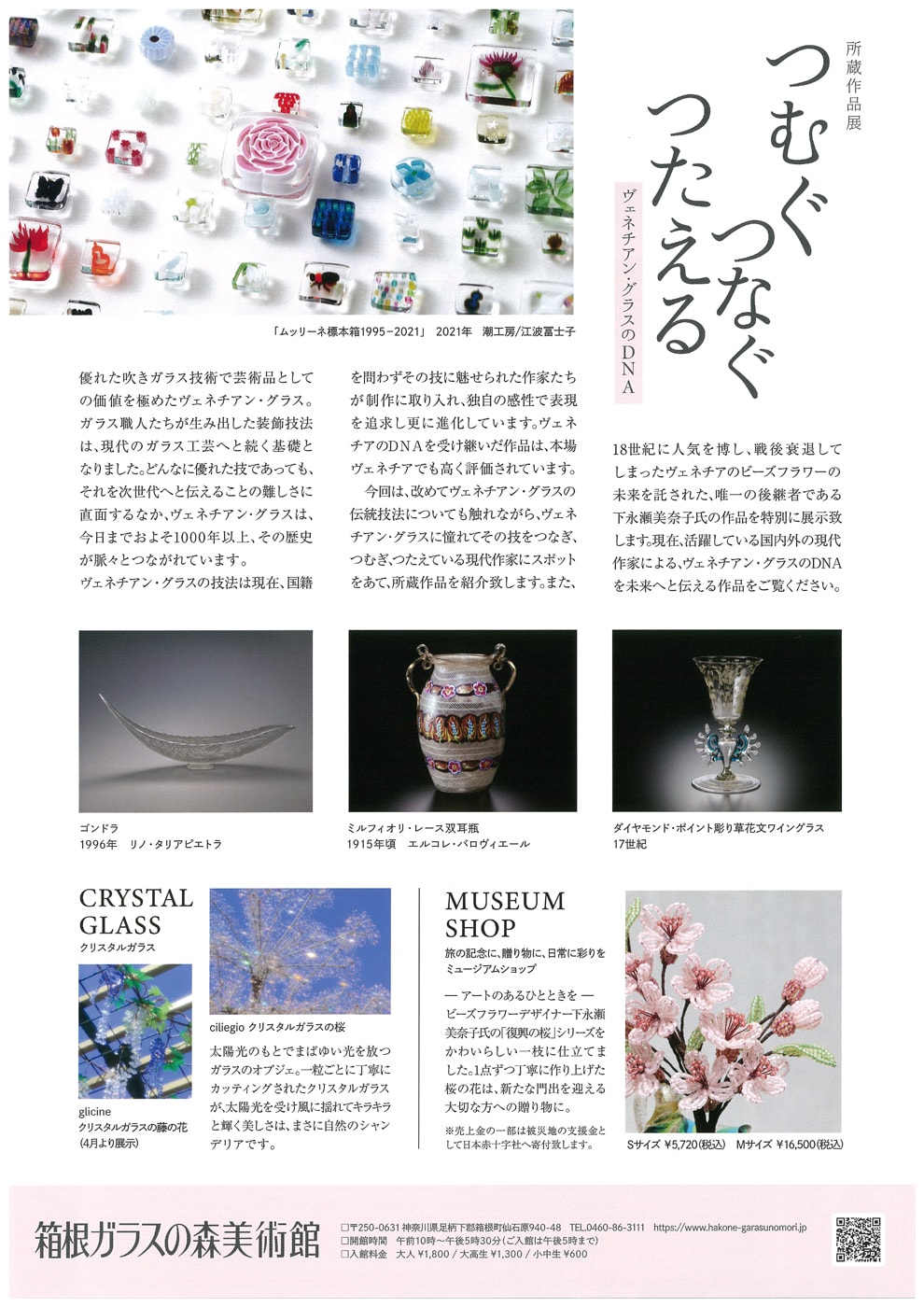 今回は、改めてヴェネチアン・グラスの伝統技法についても触れながら、ヴェネチアン・グラスに憧れてその技をつなぎ、つむぎ、つたえている現代作家にスポットをあて所蔵作品を紹介致します。また、ヴェネチアが発祥のガラスビーズで立体的な花を制作するビーズフラワーに魅せられ、唯一の後継者としてその技を託された、ビーズフラワーデザイナーの下永瀬美奈子氏の作品を特別に展示致します。現在、活躍している国内外の現代作家による、ヴェネチアン・グラスのDNAを未来へと伝える作品をご覧ください。