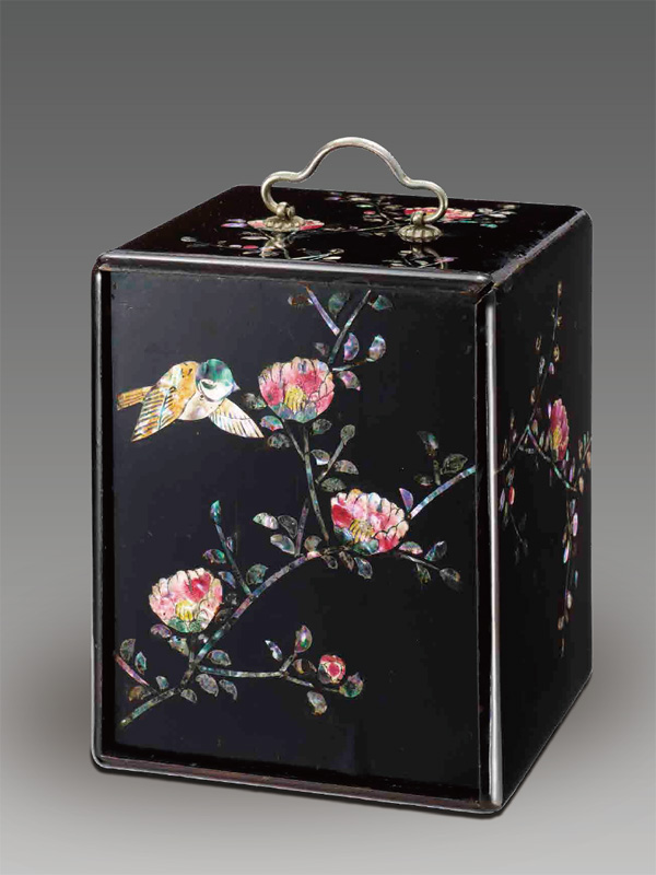 茶席で干菓子を入れて用いたものである。正面左下から両側面、背面そして天板まで枝を広げ咲く満開の花は椿と思われる。そこに一羽の小鳥が戯れる。なんとのどかで美しい風情であろうか。花の赤色、花芯の黄色、小鳥の頭部の緑、両翼の茶色、これらはいずれもアワビ貝の貝片を薄く研いで裏側から顔料で彩色したものである。