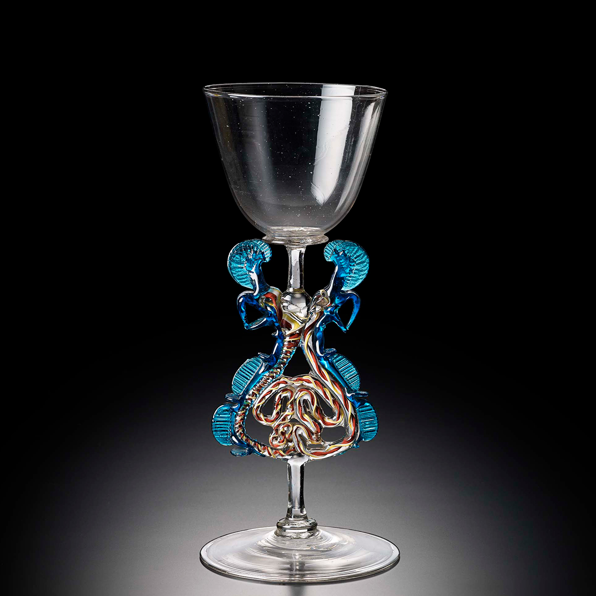 17世紀にヨーロッパで大流行し、ヴェネチアン・グラスのイメージを作り上げた特色ある脚(ステム)です。この作品は、同時期のアントワープ周辺で作られたヴェネチア風作品の典型例です。