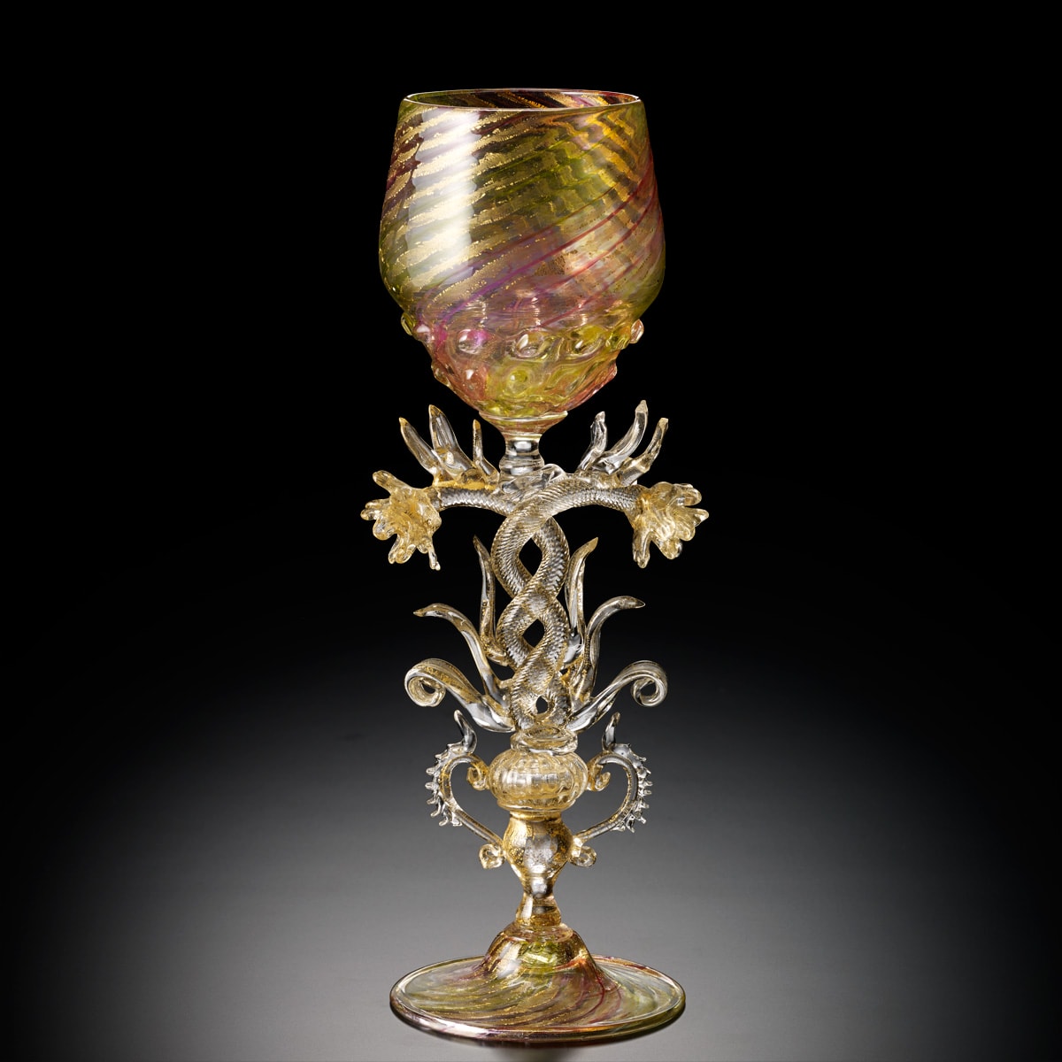 坏身は、縦モールがつけられ、ねじりながら成形することにより、斜めのラインが作られている。ラインに併せ小ガラス片による草色とピンク色の着色がされている。坏身下部は、突起状と紐状の装飾が、坏身をぐるりと一周囲んでいる。脚部は透明ガラスに金箔熔着で二層に分かれていて、上部は二本の茎がねじれ、坏身の下で左右の先端にバラの花をつけている。下部はホローノップにドラゴン・ステムのような装飾がつけられている。