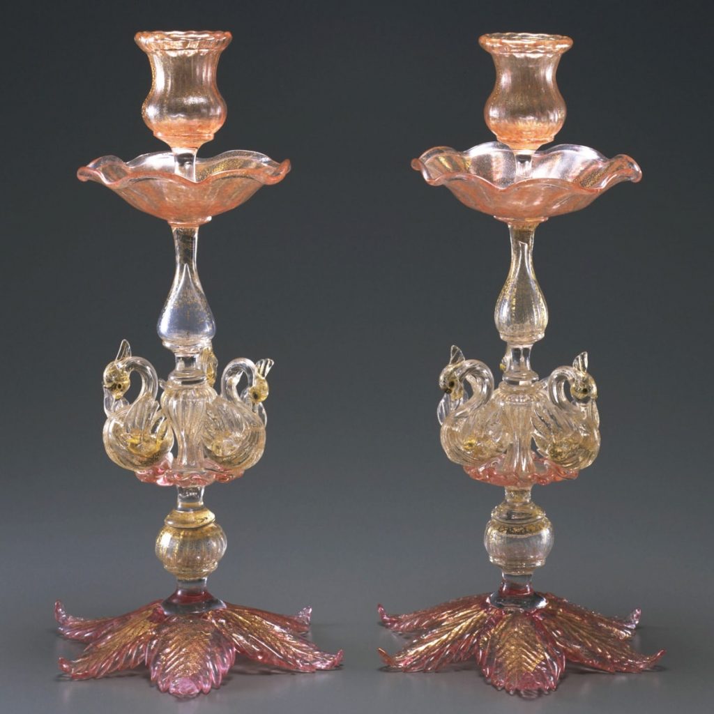 6枚の葉からなる台の上にホローノップ、その上に白鳥が3羽熔着されている。上部は花のような形の受け皿に、壷形の燭台がついていて、全体的にピンクがかったガラスに金箔熔着が施されている。