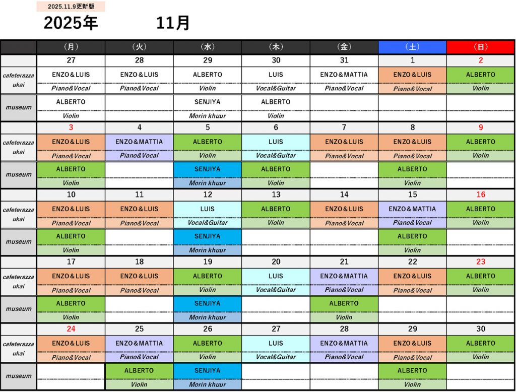 カフェレストラン 美術館内 演奏スケジュール(11月9日更新)