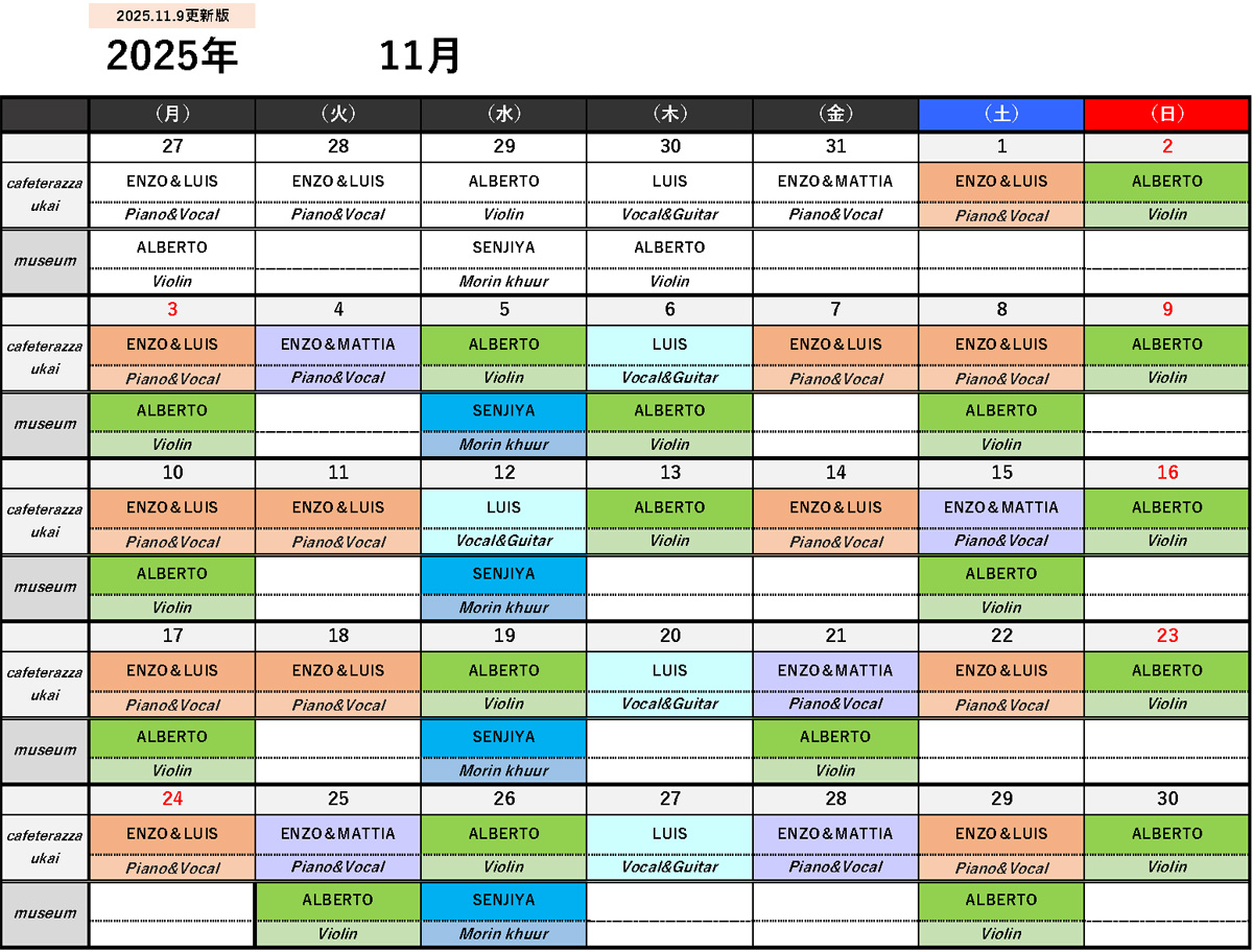 11月のカフェレストランおよび美術館内の演奏スケジュールです。