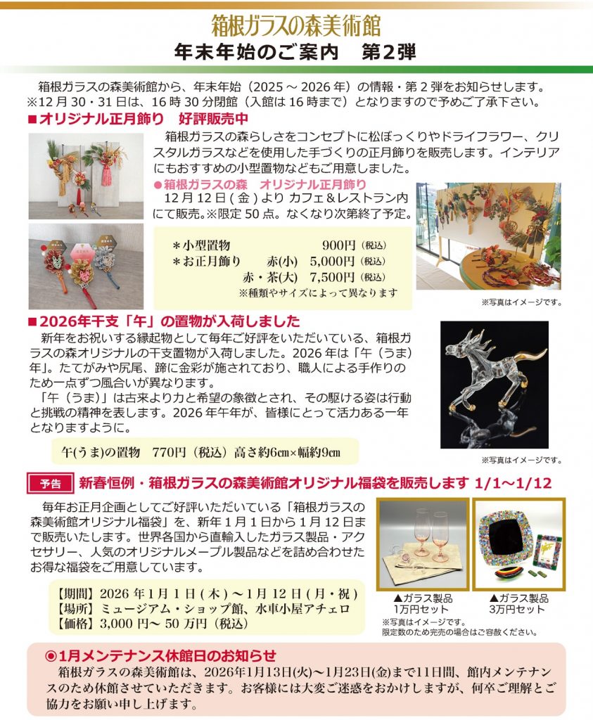 プレスリリース:年末年始のご案内箱根ガラスの森美術館は、2026年1月13日(火)~1月23日(金)まで11日間、館内メンテナンスのため休館させていただきます。お客様には大変ご迷惑をおかけしますが、何卒ご理解とご協力をお願い申し上げます。