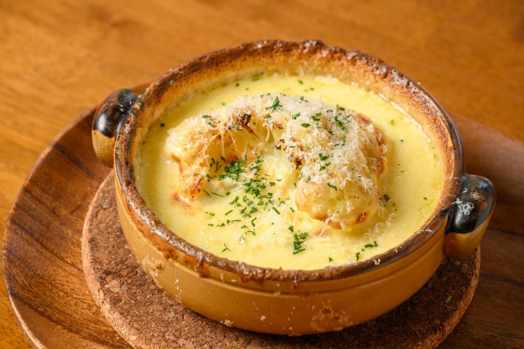 自家製クリームソースでほっこりとしたカリフラワーの旨みを閉じ込め、オーブンで焼き上げた野菜のグラタンです。