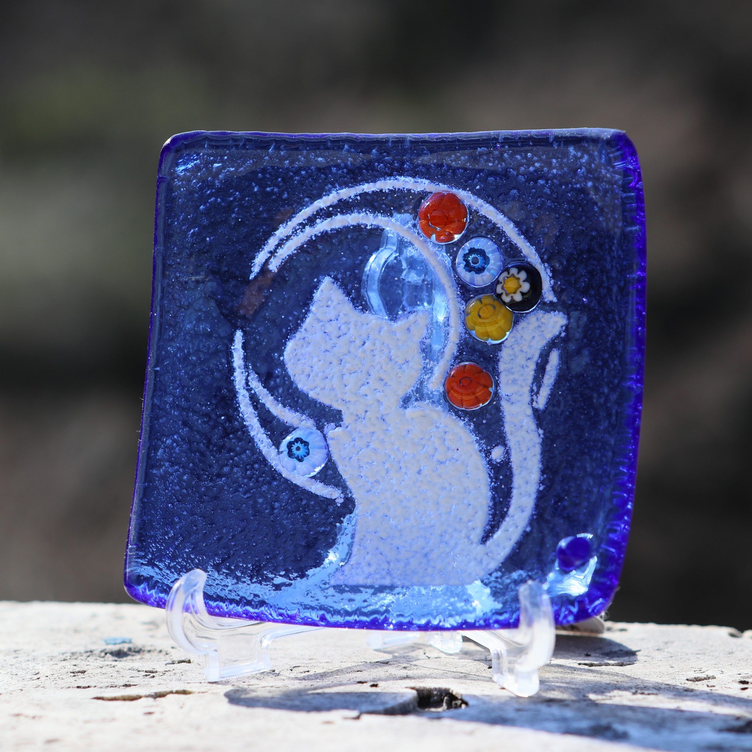 可愛らしい白猫とミルフィオリをあしらったガラス皿。