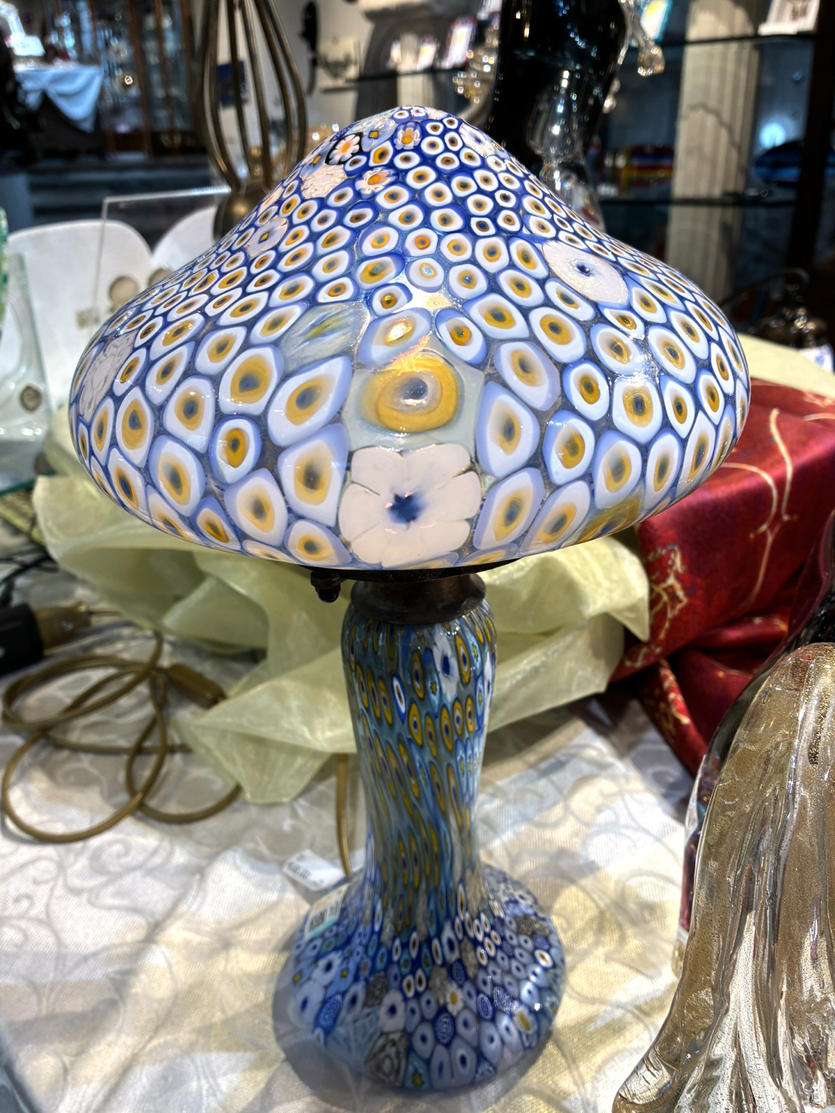 ミルフィオリ技法による、優美な模様が広がるテーブルランプ。ヴェネチアン・グラスの伝統的な美しさを象徴する逸品です。