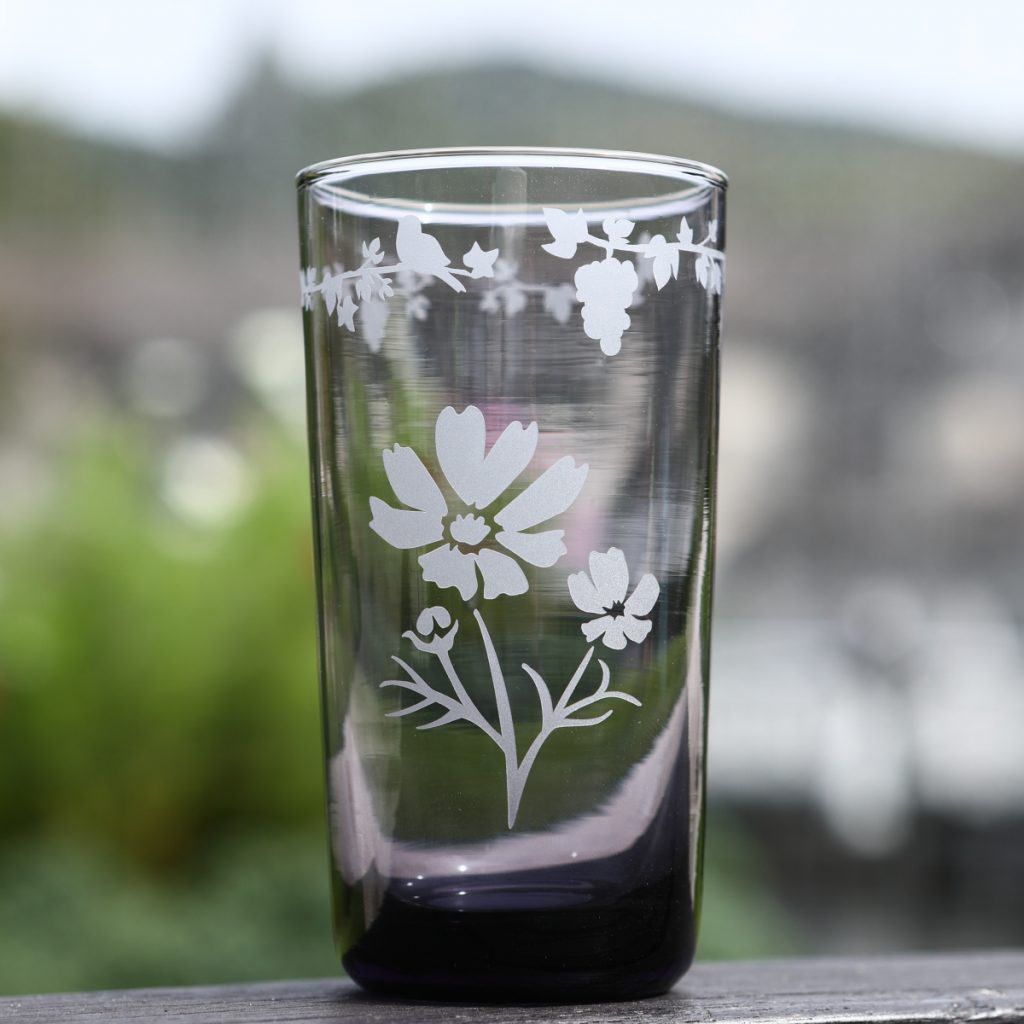 砂を吹き付けてガラスに模様を彫る、箱根ガラスの森美術館サンドブラスト体験工房では、季節限定モチーフとして「コスモス」などをご用意いたしました。