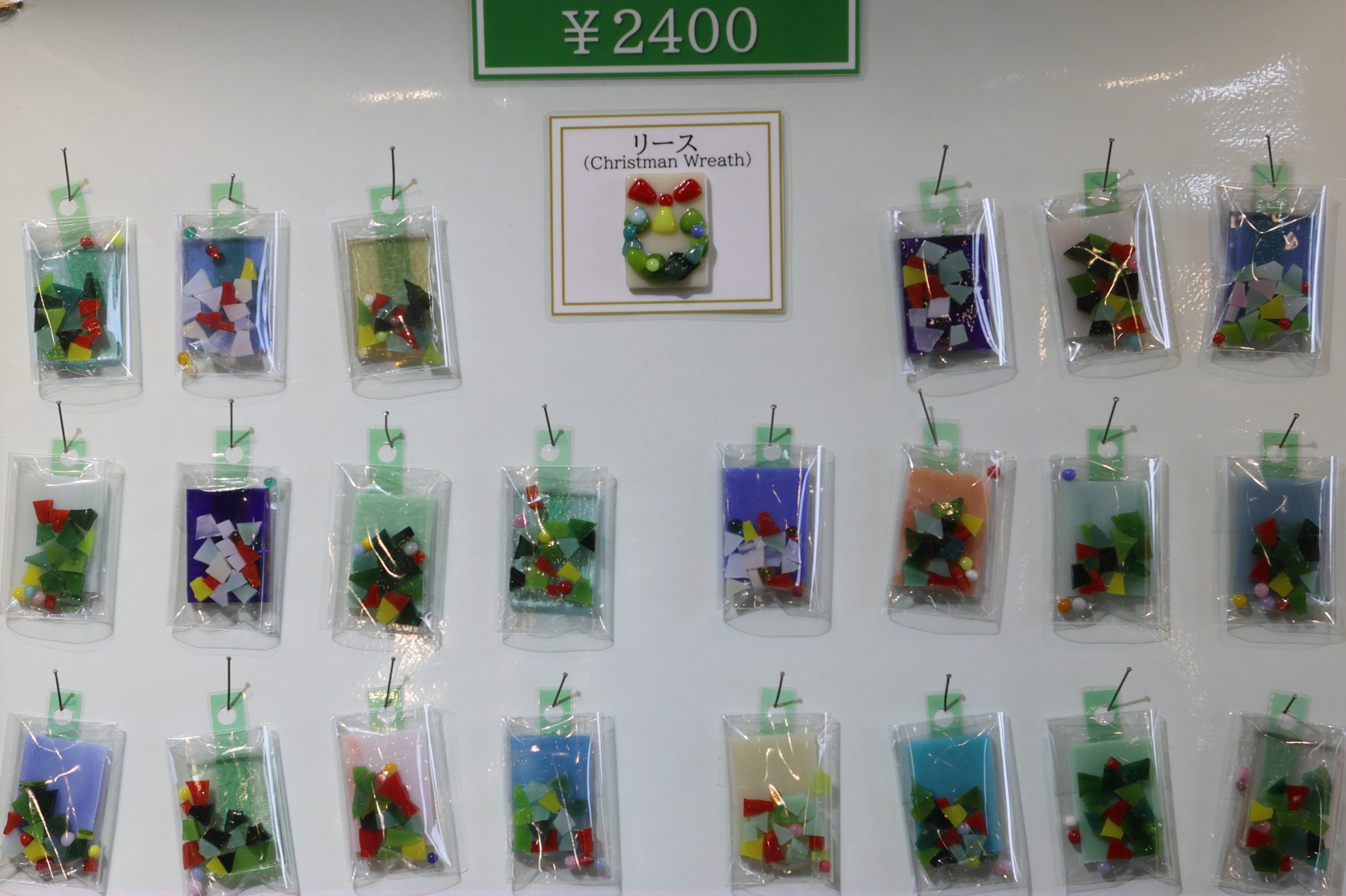 箱根ガラスの森美術館の体験工房「ヴェトロ」では、さまざまなガラスを組み合わせて熱で熔かし合わせるフュージング技法を用いたアクセサリー作りを楽しめます。通年でご利用いただけるパーツセットに加え、期間限定モチーフとして「クリスマスリース」などをご用意しております。