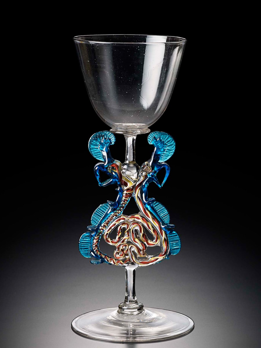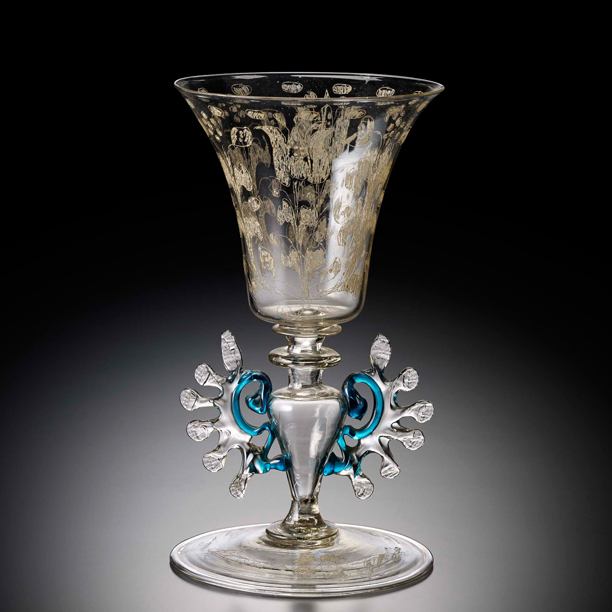 技法の広がりとともに、各地でファソン・ド・ヴェニーズ(ヴェネチア風)と呼ばれるヴェネチア様式のガラス器が作られました。なかでもレース・グラスやドラゴン・ステムなどの技法は、ヴェネチアン・グラスに匹敵するほど良質になり、ヴェネチアン・グラスに強い憧れを抱く貴族にも受け入れられヨーロッパで人気を博しました。以後、地域の特色を活かしたガラス制作へと発展し、チェコやイギリスなどヨーロッパ各地でガラス工芸が成長していきます。この章では、ヨーロッパ諸国がガラス器や職人、書籍などによりヴェネチアから伝わった技法で制作し、ヴェネチアン・グラスのDNAを引き継いだファソン・ド・ヴェニーズの作品を紹介します。